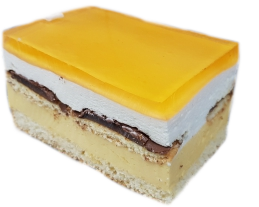 biszkopt jasny, galaretka z brzoskwiniami, nutella z kruszonym ciastkiem, śmietana kremówka