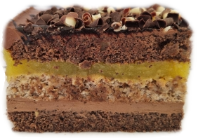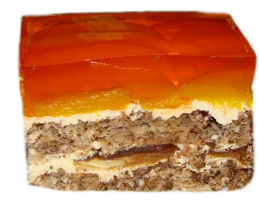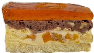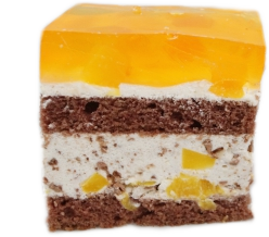 jasny biszkopt, krem waniliowy z brzoskwinią i ananasem, krem czekoladowy z kawałkami czekolady i orzechami, galaretka brzoskwiniowa
