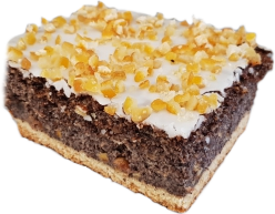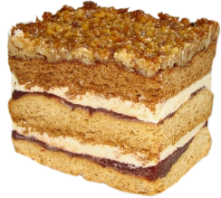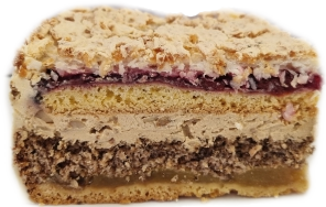 ciasto miodowe, masa grysikowa, powidło, orzechy