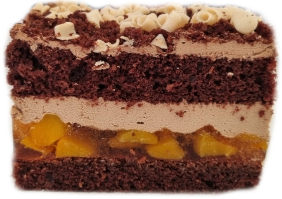biszkopt czekoladowy, galaretka z brzoskwiniami, pianka czekoladowa
