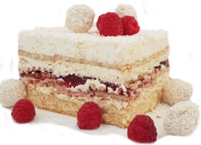 jasny biszkopt, krem rafaello z chrupką, konfitura malinowa