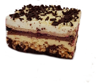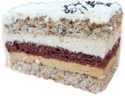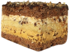 biszkopt orzechowo-czekoladowy, biszkopt jasny, masa karmelowa z prażonym słonecznikiem, masa śmietankowa z kawałkami czekolady