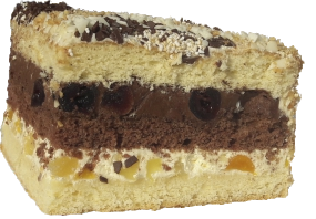 biszkopt jasny, biszkopt czekoladowy, masa śmietankowa z brzoskwinią i ananasem, masa czekoladowa z wiśnią