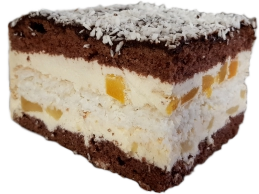 biszkopt czekoladowy, biszkopt kokosowy, masa śmietankowa z brzoskwinią i ananasem