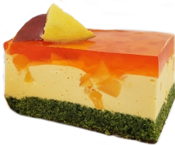 biszkopt szpinakowy, pianka Mango, brzoskwinie, galaretka brzoskwiniowa